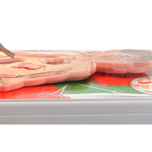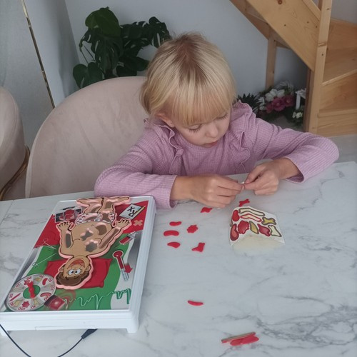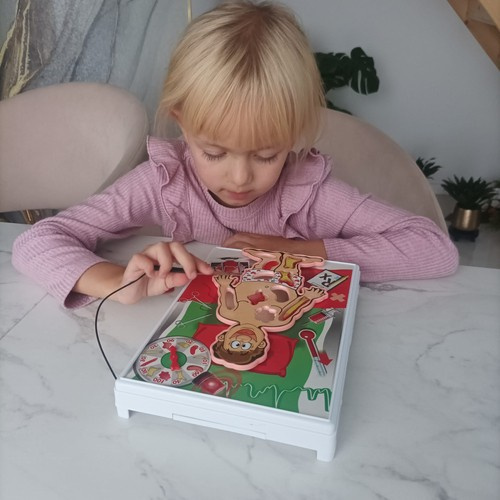 Операционная игра учит терпению и концентрации. Каждый игрок должен с помощью щипцов вытащить часть тела, указанную колесом фортуны, которое было положено на кровать пациента. Нельзя касаться края, иначе пациент «задрожит», и вы потеряете ход.