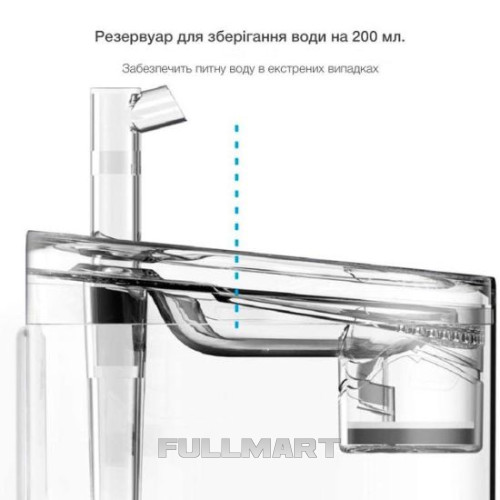 Приблизительно 200 мл воды находится в открытом мини-резервуаре, поэтому в случае остановки насоса кошка не останется без воды и сможет пить воду из мини-резервуара.