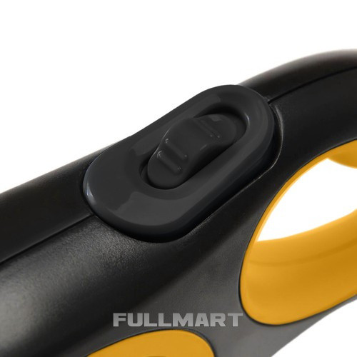 - КНОПКА БЛОКИРОВКИ — поводок имеет простую тормозную систему, останавливающую движение ремня за доли секунды. Просто сдвиньте кнопку на себя и нажмите ее вниз. Затем блокировка активируется.