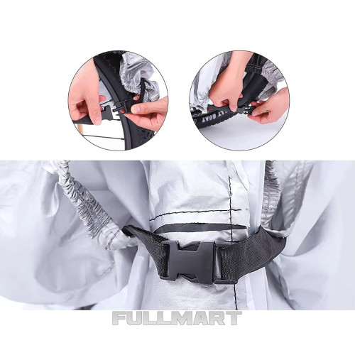 - ВШИТАЯ РЕЗИНА + БЛОКИРУЕМЫЕ МЕТАЛЛИЧЕСКИЕ КОЛЕСА + ЗАЩИТНАЯ ПРЯЖКА - чехол снизу оснащен резинкой, что позволяет прижимать чехол к велосипеду и защищать нижнюю часть велосипеда. Преимуществом этого чехла являются два металлических колеса, через которые можно поставить велосипедный замок. Затянув резинки, можно также закрепить чехол пряжкой
