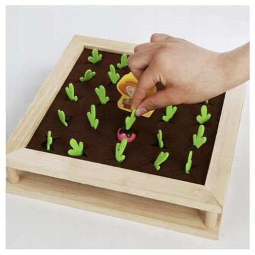 - материал: дерево, остальные: фетр) + 80 шариков (дерево) + 24 овощей (фетр) + 16 карт памяти (картон) + 8 кексов (ПВХ) + 2 палочки для еды (дерево) + ложка (дерево) + фермер (дерево)