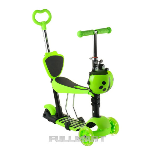 Данная модель самоката отличается конструкцией от обычных самокатов ,тем что укомплектована вспомогательной родительской ручкой, сидением для ребенка, удобной спинкой, подножкой и оригинальной корзинкой, что выделяет данный самокат на фоне остальных. Самокат подходит для детей от 1+ лет. Передние и задние колеса светятся при вращении.