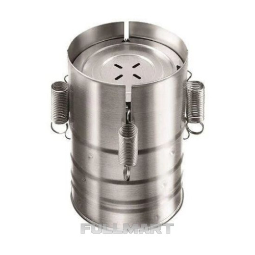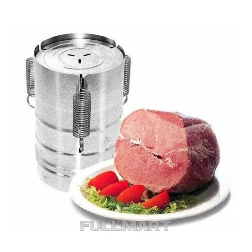Установить корпус ветчинницы на ровную поверхность боковыми прорезями вверх. Принять решение об объеме используемого продукта и установить одну из крышек на внутренние выступы корпуса: выше или ниже, в зависимости от принятого решения. Проложить внутреннюю часть корпуса фольгой или пищевой пленкой или вложить в жарочный рукав. Плотно уложить пищевые ингредиенты внуть корпуса, полностью заполнив выбранный свободный объем. Завернуть края обертки и накрыть сверху второй крышкой. Придерживая верхнюю крышку, установите три пружины, ориентируя их кольцами-захватами вниз: - верхние крючки одновременно пронизывают отверстия в верхней крышке и проходят через боковые щели корпуса. Нижние крючки попадают в технологические отверстия в центре корпуса. Затем целиком перевернуть собранную ветчинницу. Удерживая одной рукой корпус ветчинницы на ровной поверхности, по очереди взвести три пружины до самого верха корпуса, зацепив их крючками непосредственно за край корпуса.