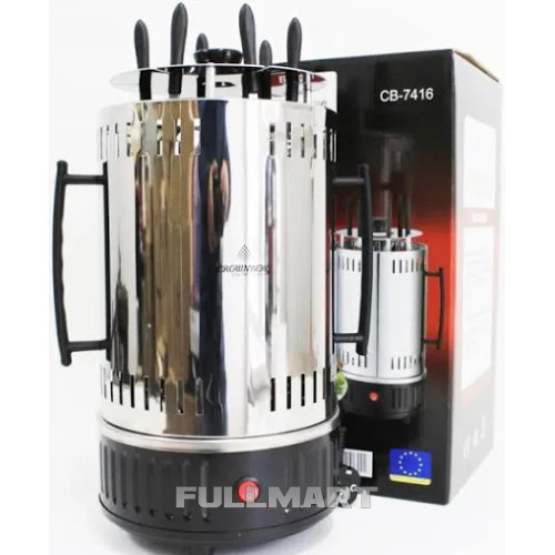 Электрошашлычница имеет цилиндрическую форму: в верхней части расположена жаровая камера, в нижней — привод шампуров. Шесть вращающихся шампуров с чашами для стекания жира и защитный кожух обеспечивают равномерное обжаривание шашлыка со всех сторон.