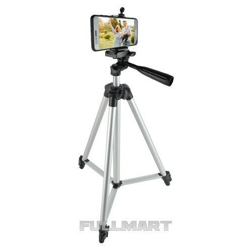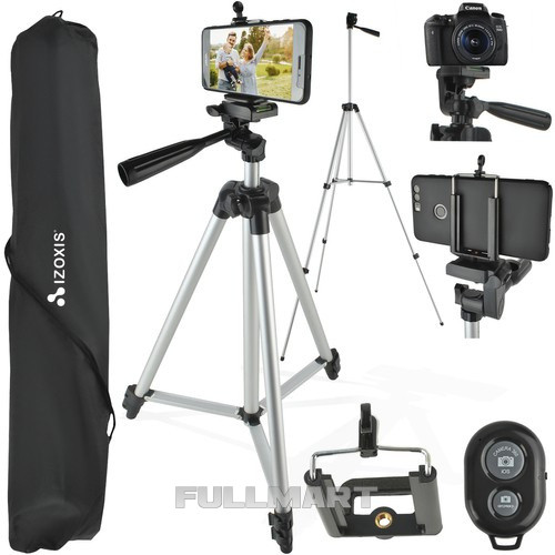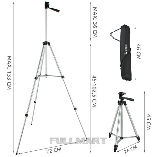 - СПЕЦИФИКАЦИЯ – материал: алюминий, другие: АБС + ПВХ) с пультом дистанционного управления (АБС) в чехле (преобладающий материал: ткань Оксфорд 210D, другие: полиэстер; размеры штатива (мин/макс высота): 45-133см; вес комплекта 450г; вес с упаковкой: 540 г.
