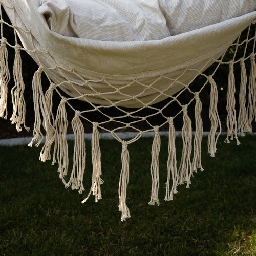 - МІЦНА МАТЕРІАЛ - бавовна забезпечує гарну вентиляцію , що підвищує комфорт використання підвісного крісла навіть у спекотні дні . Домішка поліестеру відповідає за довговічність сидіння. Міцне монтажне кільце з'єднане з міцними мотузками , рівномірно розподіленими з обох боків гамака через дерев'яну перекладину. Така конструкція дозволяє легко повісити гамак, він добре збалансований та стійкий .