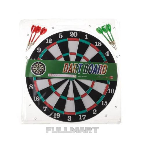 Игра выполнена в традиционном британском стиле-черно-белом секторе с зелеными и красными разграничителями; Набор для игры состоит из двухсторонней мишени и 6 дротиков; На одной стороне мишени нанесена разноцветная разметка с баллами от 1 до 20; Мишень снабжена специальным металлическим крючком; Проволоки снабжены металлическим баррелем с наконечником и легким пластиковым воротником с оперением; Металлические иглы плавно и плотно входят в поверхность мишени; Если играют два игрока, то можно сразу разделить дротики на двоих, ведь по правилам каждому участнику выдается по два снаряда.