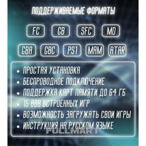 Эта суперконсоль поддерживает 10 языков, включая китайский, английский и русский, а также предлагает 9 эмуляторов для различных игровых платформ, включая PS1 и GBA.