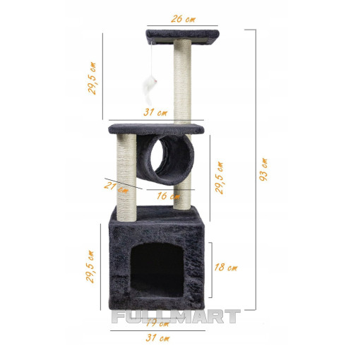- В нем есть: ТОННЕЛЬ, ДОМ-ЛАД, 3 ПЛАТФОРМЫ НАБЛЮДЕНИЯ, 1 ПОДВЕСНАЯ ИГРУШКА - МЫШЬ И ПРОЧНЫЕ КОГТАЛКИ.