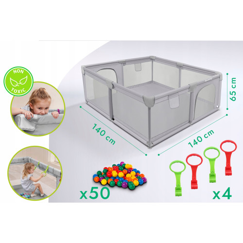 Дитячий манеж 140х140 см з чотирма ручками для дітей та 50 різнокольоровими м'ячами для гри!