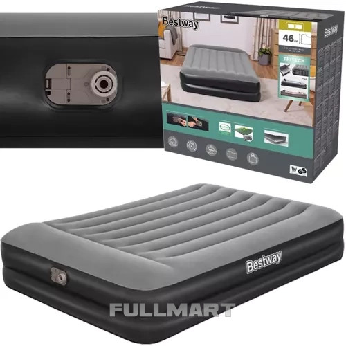 - ТЕХНИЧЕСКИЕ ХАРАКТЕРИСТИКИ – цвет: черно-серый; размер: двойной; дополнительные возможности: сумка для транспортировки, ремонтная заплатка; насос: да, встроенный; питание насоса: 220-240В; длина: 203см; ширина: 152 см; высота: 46см; вес: 7 кг.