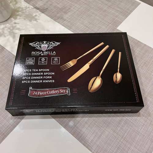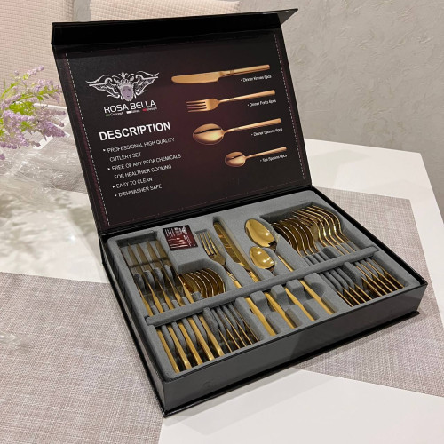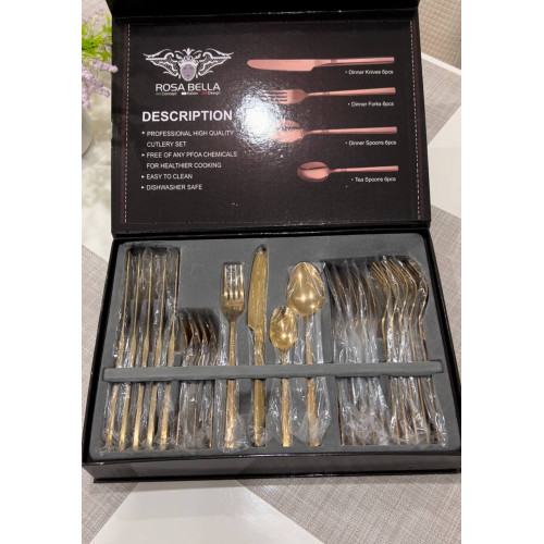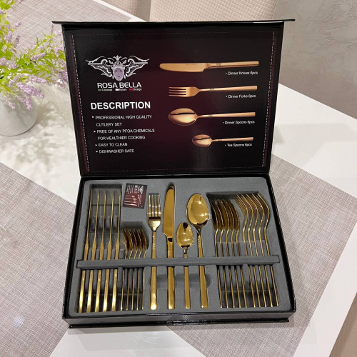 Елегантність, розкіш та висока якість виготовлення – ось лише деякі риси, що характеризують наш золотий набір столових приладів Rosa Bella. Цей повний набір з 24 елементів ідеально підходить як для особливих випадків, так і для повсякденних страв, надаючи їм нотки елегантності.