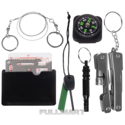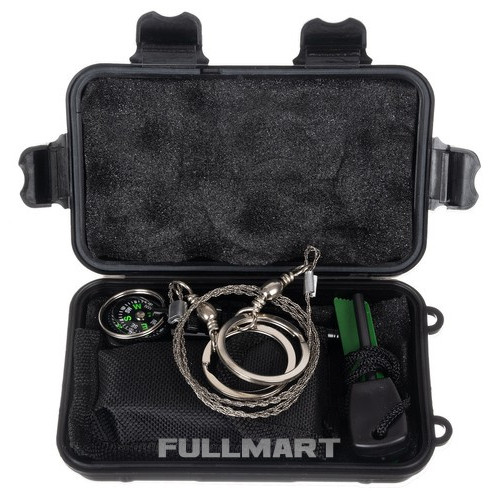 - 7в1 - в набор входит карта выживания 11 в 1, компас, мультитул, струнная пила длиной 70 см, зажигалка со стержнем на веревке, герметичный контейнер со свистком, в котором можно спрятать что-нибудь маленькое, и наклейка с предупреждениями.