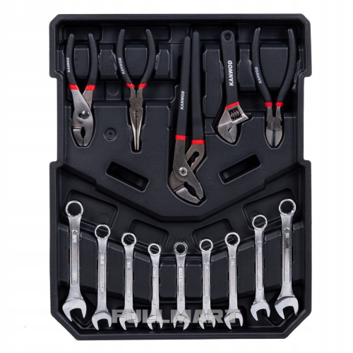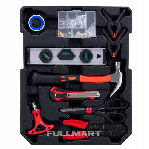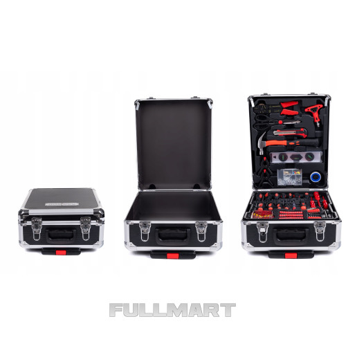 Чемодан включает в себя, среди прочего, гаечные ключи, плоскогубцы, отвертки, шестигранные ключи, плоскогубцы, молоток, спиртовой уровень, наконечники для торцевых головок и многие другие принадлежности для инструментов