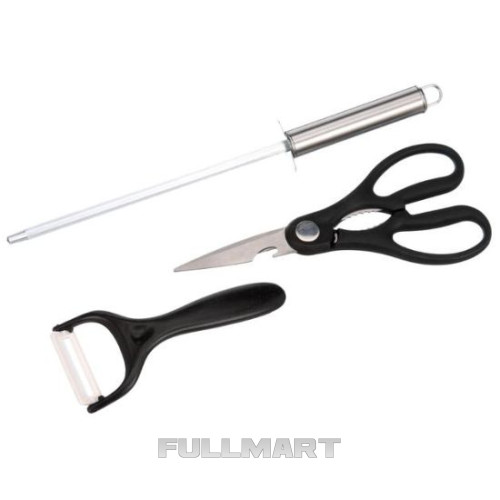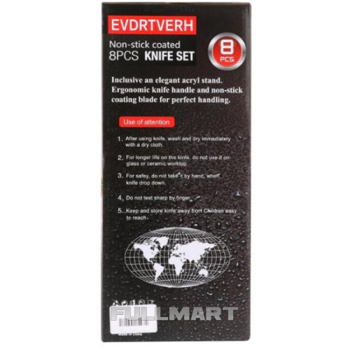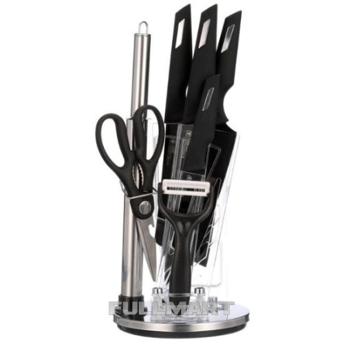В комплект входит 4 ножа (из высококачественной нержавеющей стали) разного размера и назначения, точилки, ножницы кухонные большие, овощечистка и стильная подставка для набора. Рукоятки ножей могут быть черного и коричневого цвета. Ручка изготовлена из удобного полипропиленового материала, а ручка имеет круглую канавку, которая хорошо прилегает к вашим пальцам и обеспечивает удобный захват.