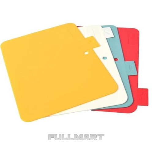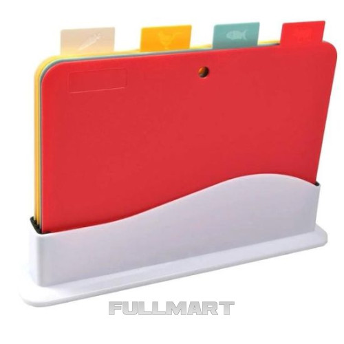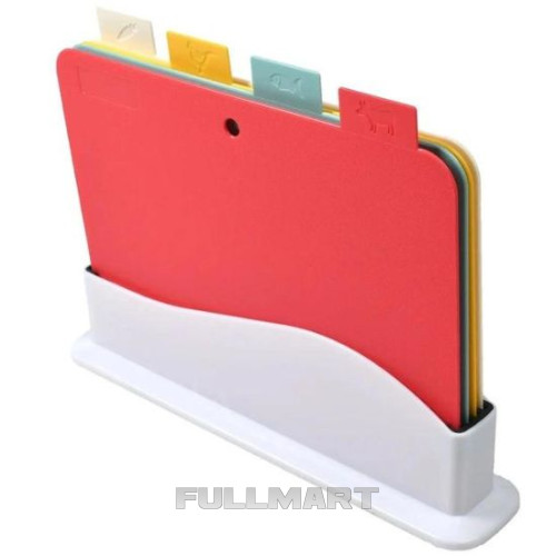 Набор Supretto состоит из разноцветных досок, размещённых в оригинальной подставке, что делает его не только многофункциональным, но и удобным для хранения на кухне. Каждая доска разного цвета, что помогает различать их по назначению.