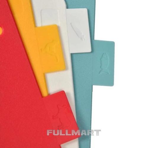 Каждая доска из набора имеет свою эмблему, которая означает ее предназначение. Красную доску следует использовать для сырого мяса, синюю – для рыбы, желтую – для копченых блюд, а зеленую – для овощей и фруктов.