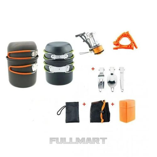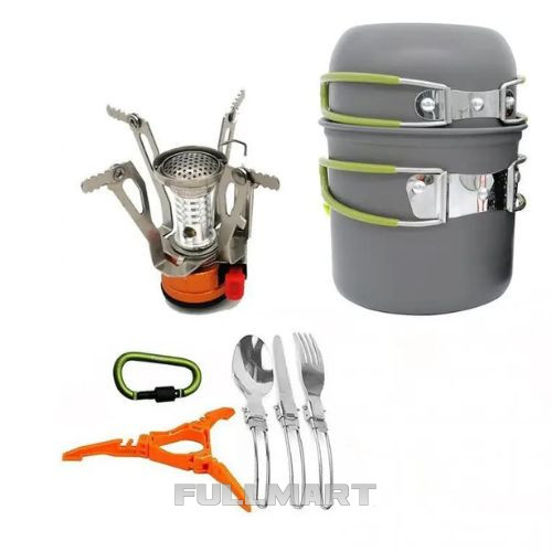 Части набора компактно складываются друг в друга. Размер котелка позволяет вложить внутрь кружку, горелку, ложку и тряпку для мытья посуды. Весь комплект занимает минимум места и веса, поэтому с ним очень удобно в походе.