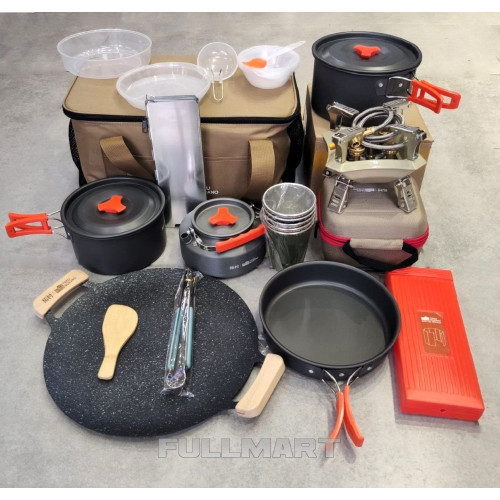 Включает в себя: котелок, чайник, кружку, тарелки, салфетку