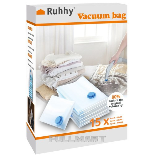 Набор из 15 вакуумных пакетов многоразового использования. Хранящиеся вещи прекрасно защищены от пыли, грязи, воды, влаги и моли. Одежда, хранящаяся без доступа воздуха, дольше остается свежей и выглядит как новая. Чтобы высосать воздух, достаточно воспользоваться обычным пылесосом. Сумки позволят вам сэкономить много места.