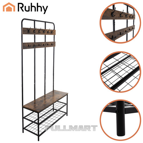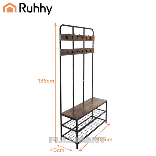 Вертикальная полка Ruhhy с вешалкой - 182x100x35,5 см - скамья со сиденьем и 2 полками для обуви - 12 крючков для одежды - металлический каркас-чердак - устойчивый органайзер для прихожей