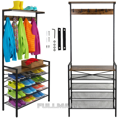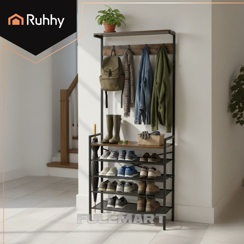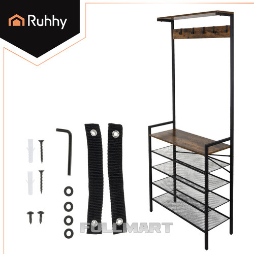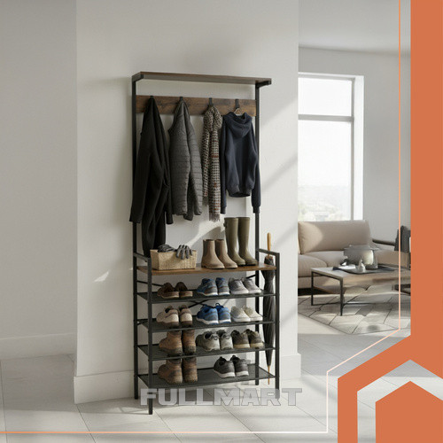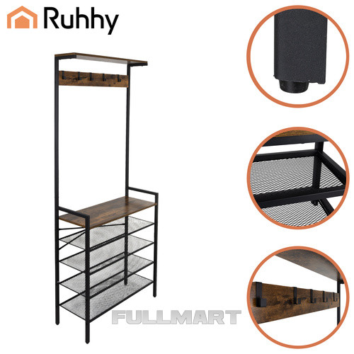 Отдельно стоящая полка Ruhhy с вешалкой — идеальное решение для хранения курток, обуви и сумок под рукой, сохраняя при этом элегантный вид. Прочный металлический каркас добавляет индивидуальности, а четыре просторные полки и пять крючков помогают поддерживать порядок без компромиссов — всё будет организовано, на виду и готово к выходу из дома.