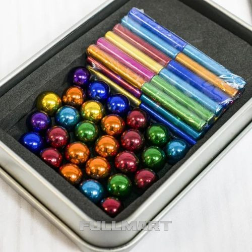 36 магнитных палочек, 27 металлических шариков, упакован в металлическую коробку.