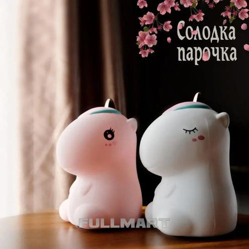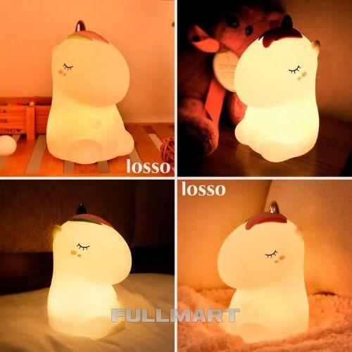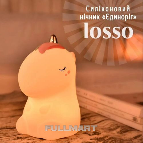 Единорог Losso – это светодиодный ночник со всеми цветами радуги. Сенсорный ночник имеет 2 режима работы. Нажимая кнопку включения с нижней стороны, светильник начнет светиться теплым белым светом. При легком хлопке по макушке Единорога он начнет менять цвет по кругу каждые 3 секунды и будет работать в таком режиме до следующего хлопка. Второй хлопок фиксирует цвет – Единорог будет светиться в одном свете до следующего – третьего хлопка. Последний – выключает лампу. А дальше все поначалу.