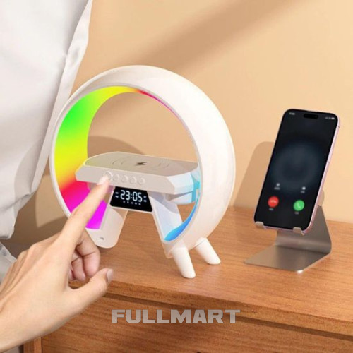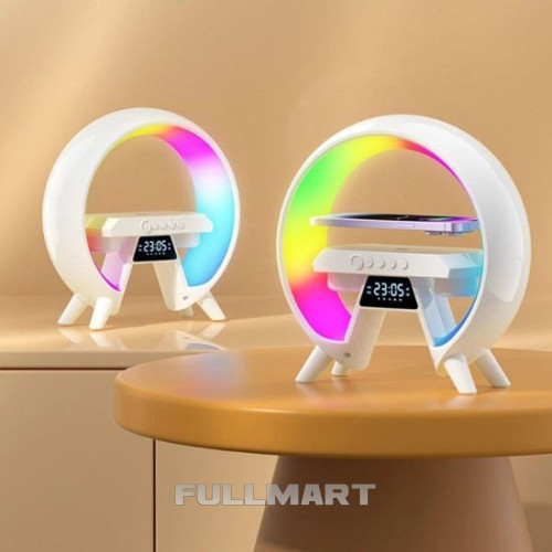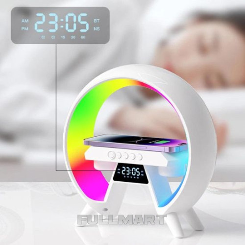 Ночник с часами и будильником беспроводной зарядкой аккумуляторная Bluetooth колонка 15W RGB светильник