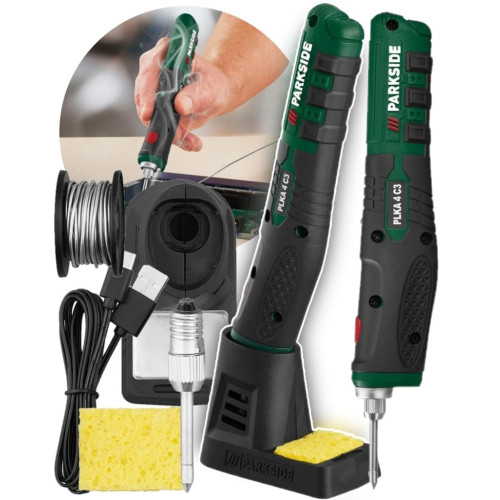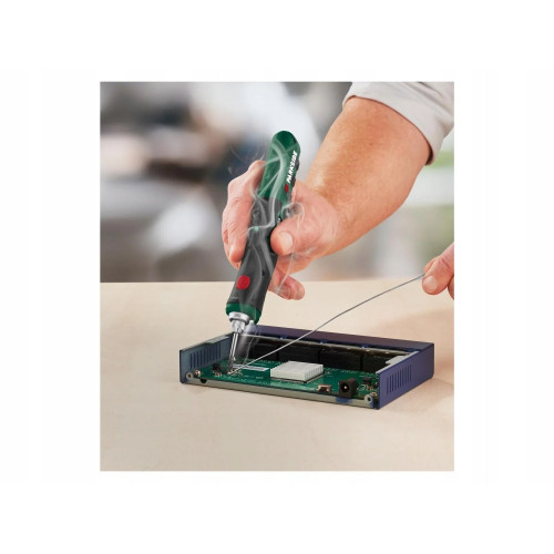 Комплектация: 1 паяльное жало, 10 г припоя (Ø 1,0 мм в рулоне), 1 станция со встроенной полкой для губок, 1 губка для очистки паяльных жал, кабель USB-C для зарядки (1 м)