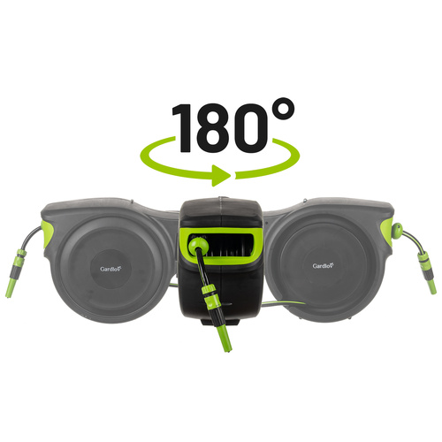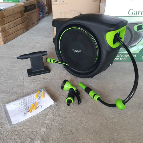полный комплект для полива – вы получаете все необходимое: автоматическую катушку, 25 м шланга, 7-функциональный пистолет, насадки, соединители, настенный кронштейн с поворотом на 180° и даже 2-метровый шланг подачи