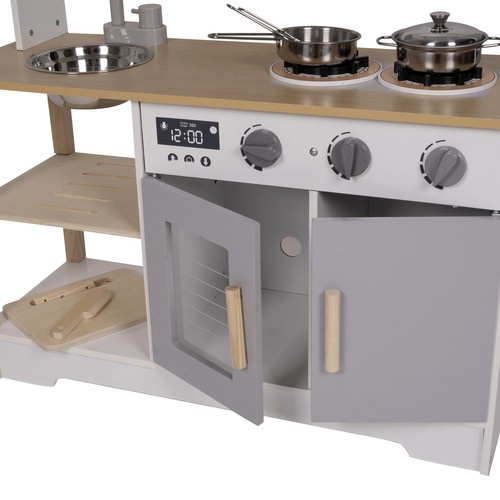 Деревянная игрушечная кухня имеет модный, современный вид, который оценит каждый начинающий шеф-повар. Имеет имитацию двух конфорок, на которых можно готовить вкусные блюда. После поворота ручек вы услышите характерный щелчок. Закончив трапезу, вам все равно придется мыть посуду, используя раковину.
