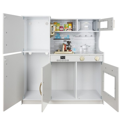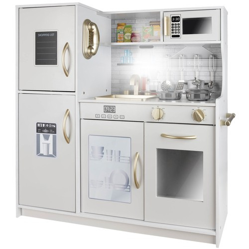 - СВЕТОДИОДНОЕ ОСВЕЩЕНИЕ И ЗВУК - на кухне имеется светодиодная лампа, которую можно разместить под шкафом, в шкафу или в духовке - выбор за вами! Освещение заставит ребенка почувствовать себя так, как будто он находится на настоящей кухне , причем эффект будет еще сильнее, когда в комнате темно, а лампа позволит ребенку приготовить ужин для кукол, плюшевого мишки или их родителей. . Кроме того, при повороте ручек конфорки плиты издают щелкающий звук ! Ваш ребенок будет в восторге – кухня позволит провести много часов веселья.