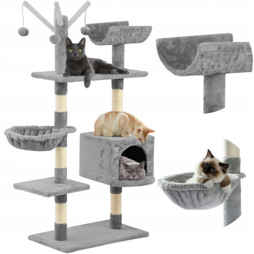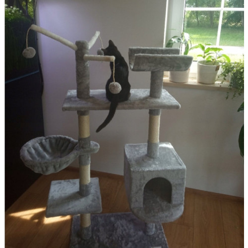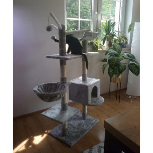 На пяти уровнях разместятся четыре смотровые площадки, очень просторный домик, гамак-берлога, идеальный для отдыха, и площадки, покрытые приятным плюшем. Кроме того, в самой высокой точке подвешены 4 помпона, которые будут развлекать нашего пушистого друга.
