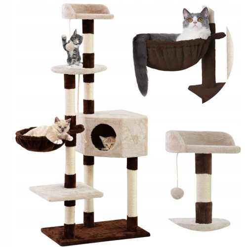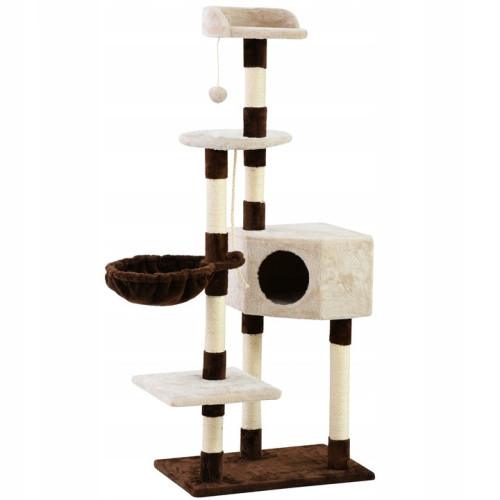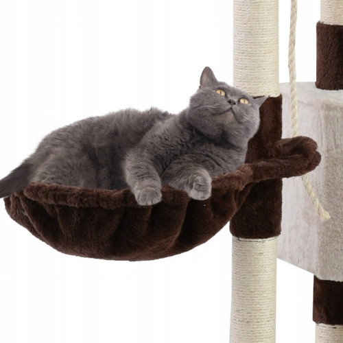 Здесь будут смотровые площадки, просторный и комфортабельный домик и гамак на шести уровнях . Под верхним уровнем находится помпон, который развлечет нашего пушистого друга. Столбы, обмотанные веревкой из сизаля, позволяют кошке точить когти. Устойчивое основание удерживает всю конструкцию на месте и обеспечивает безопасную платформу для подъема.