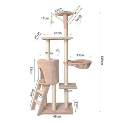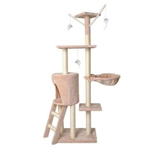 Полы кошачьей когтеточки покрыты очень мягким мехом, что гарантирует комфортный отдых с мурлыканьем на заднем плане . Главное достоинство дерева - уютный домик, к которому ведут две ступеньки. Дополнительный вариант отдыха - логово на 3-м уровне когтеточки. Котенок сможет свободно отдыхать. 3 уровня наблюдения удовлетворят кошачье любопытство. В случае скуки вы также можете поохотиться на 3 мышей, закрепленных на резинках , которые расположены на 4 и 5 этажах когтеточки - вы можете их поймать и атаковать.