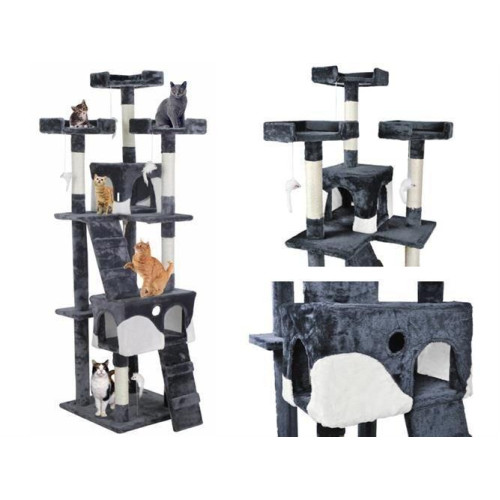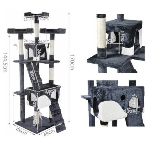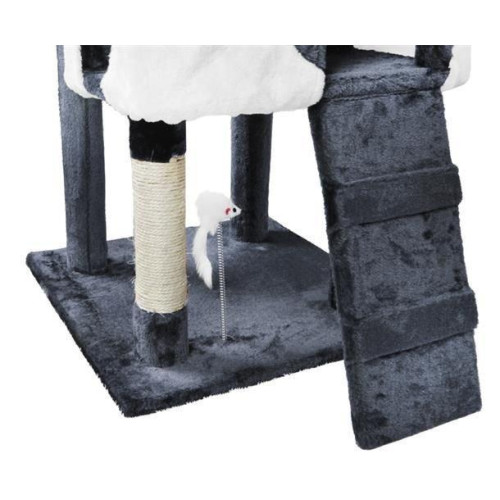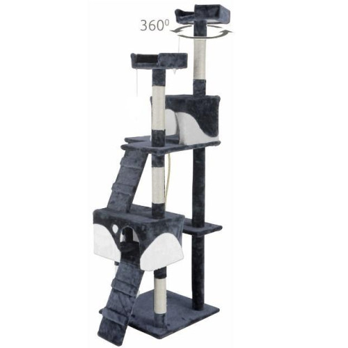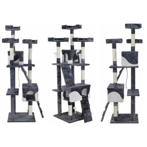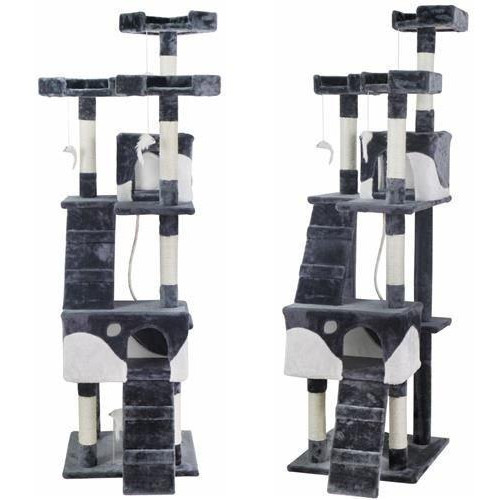 Полностью оборудованная кошачья когтеточка с лестницами, домиками, шезлонгами и террасами,где котенок может отдохнуть. Все это покрыто мягким велюром, что позволит кошке играть часами. Устойчивое основание и большое пространство делают когтеточку подходящей даже для нескольких кошек. Чехлы для домиков съемные, поэтому их можно стирать.