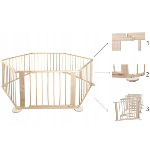 Манеж изготовлен из экологически чистого материала, который удобен для людей и животных; страдающим аллергией это особенно понравится, поскольку они обладают электростатическими свойствами, древесина не заряжается электричеством - она не собирает пыль и не плавает в воздухе. Обозначение определенной области в помещении или на улице помогает заботиться и гарантировать безопасность . Деревянный многовариантный манеж с воротами - это устройство, которое не только легко установить и использовать сразу после установки. Это также ферма, состоящая из 6 панелей, которые можно настроить любым способом . Манеж безопасен и стабилен, так как имеет нескользящие ножки с нецарапающейся пеной , Поэтому его можно размещать на любой ровной поверхности без чрезмерного риска. Складная манеж изготовлен из массива сосны и ее поверхность гладко отполирована , как на поперечных элементов, а также по углам. Все детали дополнительно закруглены , что определенно сводит к минимуму риск получения травмы даже в случае прямого, динамического контакта.