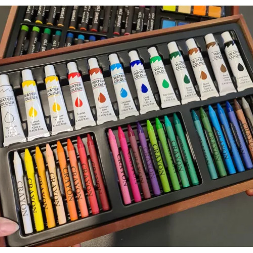 - МНОГО КОМПОНЕНТОВ - набор для рисования в чемодане состоит из множества элементов: 24 карандашных мелка; 12 акварельных красок; 24 масляные пастели; 24 восковых мелка; 2 шт карандашей HB I 2B; точилка 1 шт; 1 шт ластик; 24 акварельные краски на палитре; 2 альбома для рисования (А4 и А5); 12 шт. кисти; 1 шт. поддон; 1x чехол