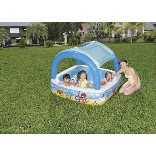 - НАдувной навес – бассейн предназначен для самых маленьких детей, благодаря устойчивому надувному навесу защищает от чрезмерного солнечного света. Навес предотвращает солнечные ожоги во время долгих летних игр.