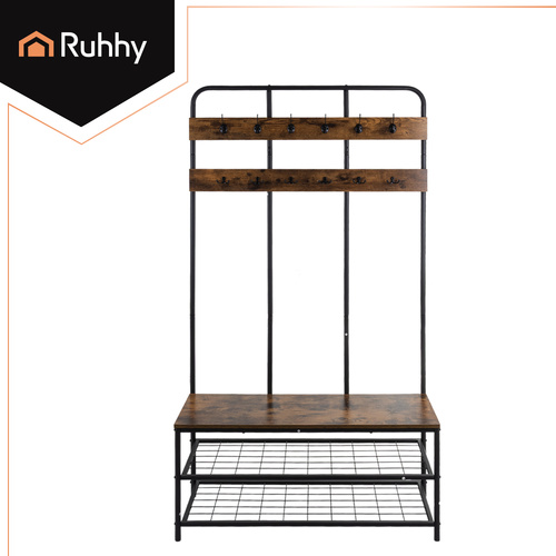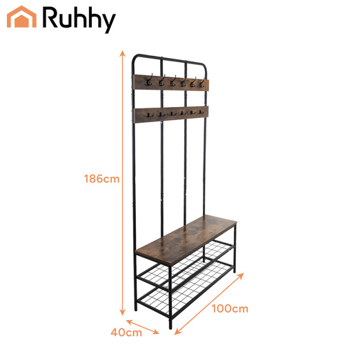 Вертикальная полка Ruhhy с вешалкой - 182x100x35,5 см - скамья со сиденьем и 2 полками для обуви - 12 крючков для одежды - металлический каркас-чердак - устойчивый органайзер для прихожей