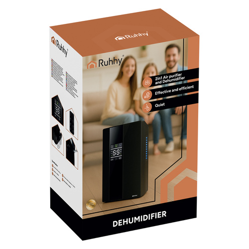 Позаботьтесь о чистый, сухой и свежий воздух у вас дома благодаря устройству «2 в 1». РУХИ Этот комбинированный осушитель и очиститель воздуха эффективно удаляет излишнюю влагу, освежая помещение, устраняя духоту и улучшая качество дыхания. Бесшумный, энергоэффективный, с сенсорной панелью управления, пультом дистанционного управления и интеллектуальной системой регулировки влажности, он идеально подходит для ванных комнат, кухонь и спален. Он работает автоматически, точно по мере необходимости.