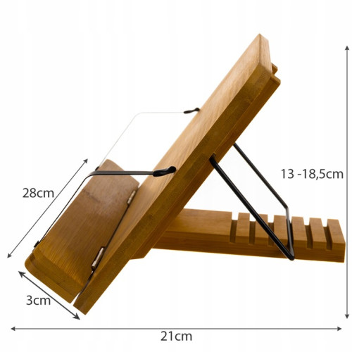 - СПЕЦИФИКАЦИЯ — материал: бамбук/железо; размеры подставки: 28 х 3 см; размеры: 21 х 28 х 13-18,5 см; вес: 779 г; вес в упаковке: 882 г.