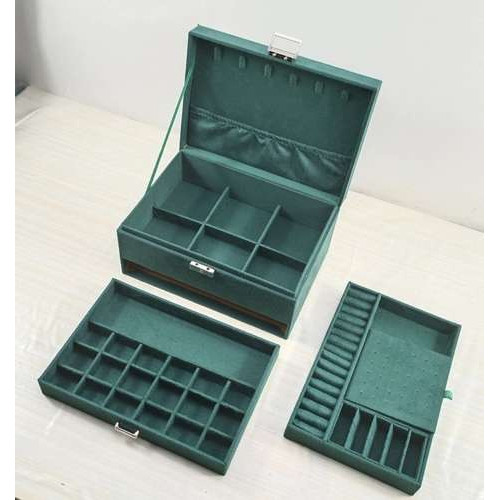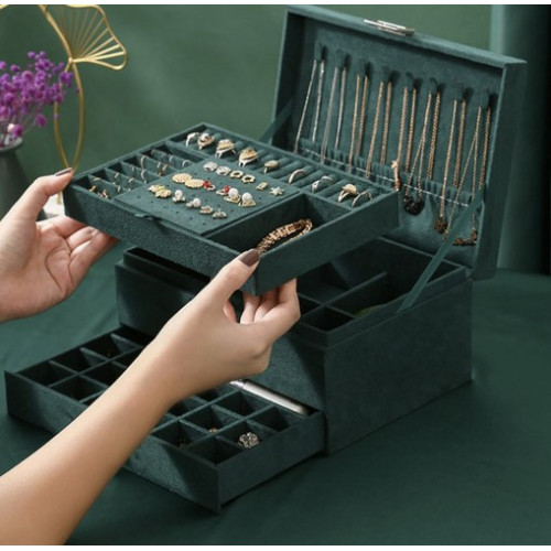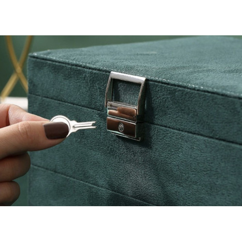 - СПЕЦИФИКАЦИЯ – материал: замша; конструкция: плита МДФ, флизелин; прочее: бумага, картон, пенопласт, нейлон; металлические элементы; цвет: оттенки зеленого; 8 цепных вешалок; 15 слотов для колец; 6 узких отделений; 1 карман на резинке; 18 мест для серег-пусетов; 9 отделений для подвесок; 6 больших отделений; 18 отделений в ящике; 1 продолговатое отделение для часов; размеры закрытого корпуса (длина/ширина/высота): 11,5 х 24,5 х 17,5 см; вес: 0,94 кг. вес упаковки: 1,168 кг.