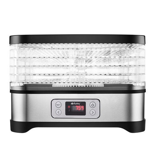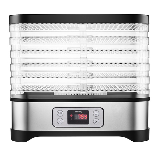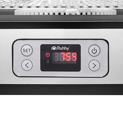 Универсальная сушилка RUHHY мощностью 400 Вт позволяет сушить грибы, фрукты, овощи и зелень — имеет целых 5 лотков общей емкостью 10 литров, регулируемую температуру (35-70 °C) и понятный дисплей с программатором до 24 часов. В комплект также входят лотки для жидких продуктов, сетки и антипригарные коврики — для максимального удобства. Энергосберегающая и изготовлена из безопасных материалов BPA FREE — идеально подходит для домашней кладовки круглый год.