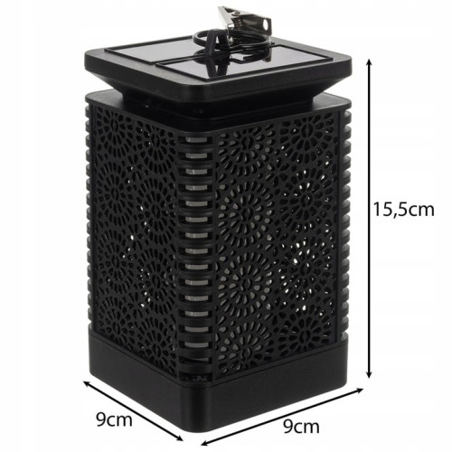 ТЕХНИЧЕСКИЕ ХАРАКТЕРИСТИКИ – цвет: черный; цвет свечения: теплый белый (имитация пламени); материал: ABS, железо; датчик сумерек: ДА; аккумулятор: 3.7V 600mAh; источник света: SMD LED; мощность: 1,2 Вт; светоотдача: 30 лм; угол луча: 360°; водонепроницаемость: IP44; время зарядки: 6-8 часов; время работы: 8 час; размеры: 15,5 х 9 х 9 см; вес: 0,2 кг; вес в упаковке: 0,3кг.
