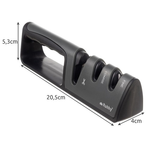 - СПЕЦИФИКАЦИЯ - материал: АБС + керамика + металл; количество точилок: 3; противоскользящие ножки: да; размеры: 20,5 х 4 х 5,3 см; вес: 122 г; вес в упаковке: 157 г.