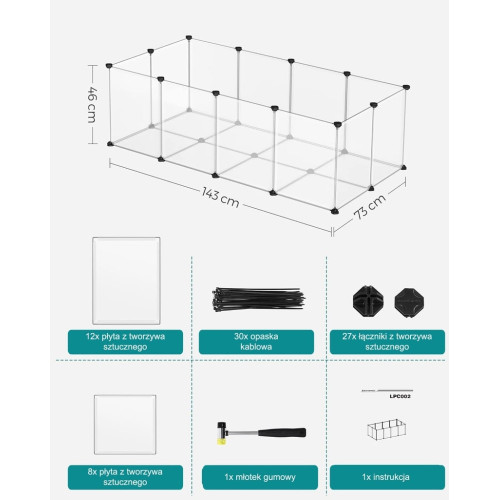 Этот кроличий выгул очень легко собрать. Просто соедините пластиковые панели с помощью угловых соединителей и входящего в комплект резинового молотка, чтобы создать выгул для вашего любимца в кратчайшие сроки.