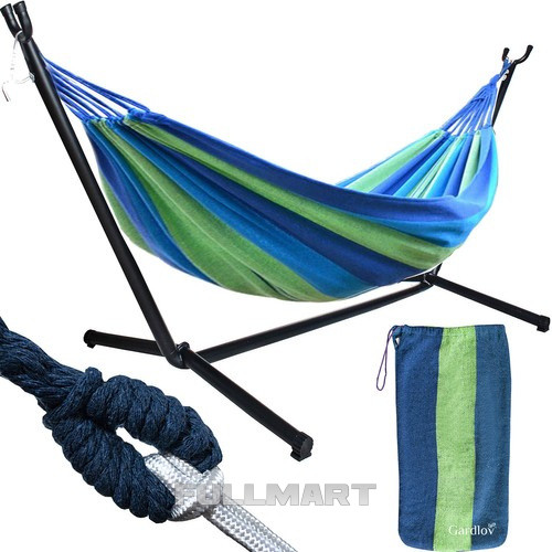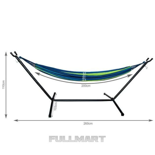 - СПЕЦИФИКАЦИЯ - цвет: многоцветный; материал: (хлопок+полиэстер) с каркасом (железо+ПП+нейлон) чехол (нейлон, полиэстер, хлопок); максимальная нагрузка: 200 кг; размеры рамы (ширина/высота): 260/110 см; размеры гамака (длина/ширина): 200/150 см; вес: 13 кг; вес в упаковке: 13,5 кг.