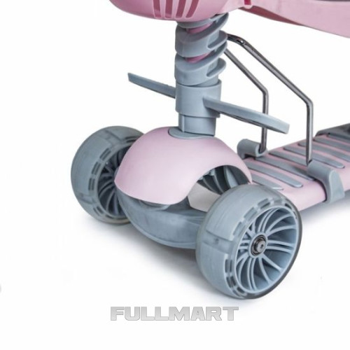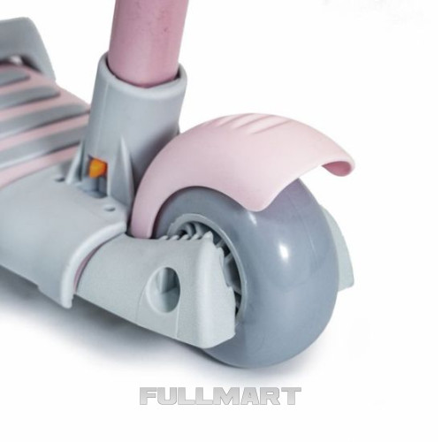 Колеса размером 120 мм изготовлены из прочного полиурилетана оснащены подшипниками ABEC 7 благодаря которым самокат достаточно быстро разгоняется а так же его легко котить, что значительно упрощает нагрузку на маму. Передние колеса светятся во время катания, на заднем колесе размещен ножной тормоз - который срабатывает быстро и четко!